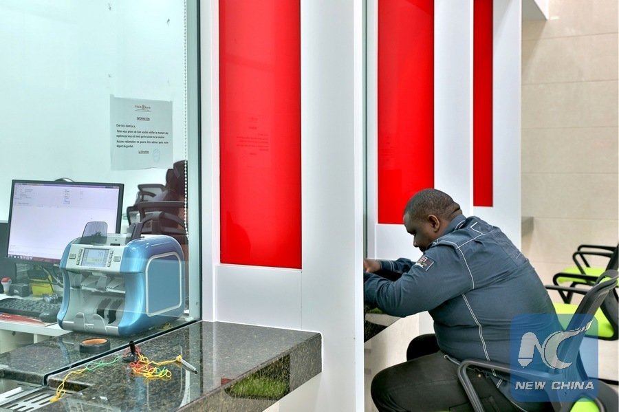 A duty officer sits in the new office building of the Sino-Congolese Bank for Africa (BSCA) in Brazzaville, capital of Republic of Congo, on June 9, 2018. (Xinhua/Wang Teng)