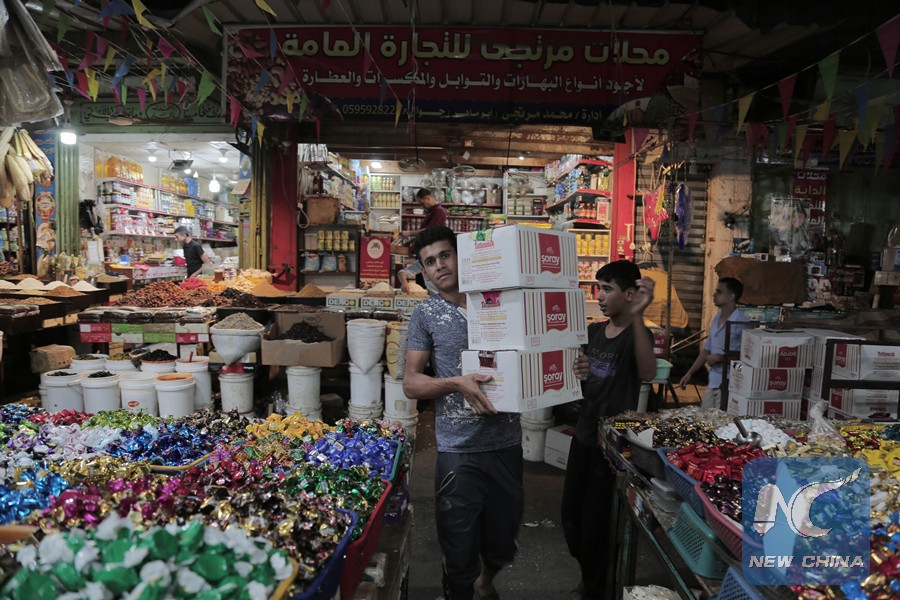 A Palestinian vendor sells sweets at a market ahead of the Eid al-Fitr in Gaza City, on June 11, 2018. Muslims around the world prepare for the Eid al-Fitr which marks the end of the fasting month of Ramadan. (Xinhua photo)