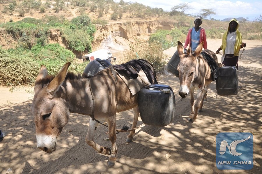 Girls drive donkeys to fetch drinking water from a river in Naivasha, about 90 kilometers northwest of Nairobi, capital of Kenya, Dec. 2, 2013. (Xinhua/Allan Muturi)