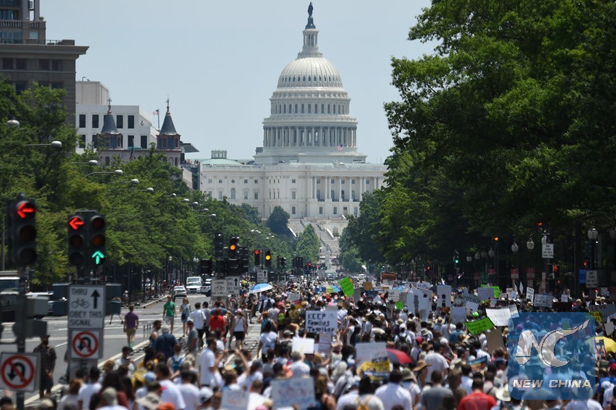 Tens of thousands of people march to protest theTrump administration's "zero tolerance" immigration policy, near the Capitol in Washington, D.C. United States, on June 30, 2018. (Xinhua/Yang Chenglin)