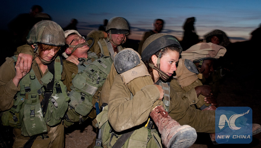 Israeli female soldiers carry the "injured" with their male counterparts during a live-fire drill in southern Israel on Dec. 13, 2012. (Xinhua/Yin Dongxun)