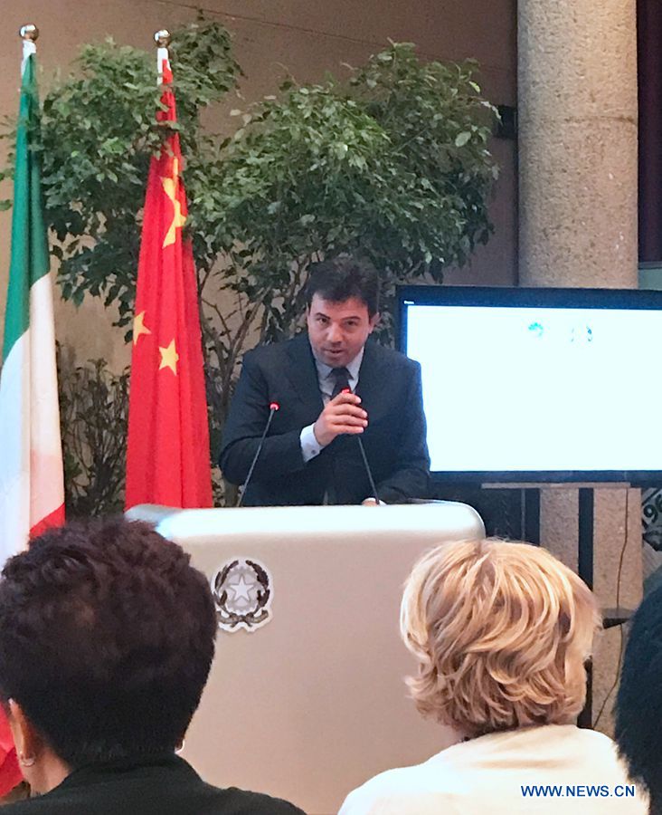 An Italian government official representing the region of Campania speaks during a press conference on the launch of tourism cooperation between China International Travel Service Limited, Head Office (CITS) and four regions of Italy held in Beijing, capital of China, July 16, 2018. (Xinhuanet/Zhou Xin)