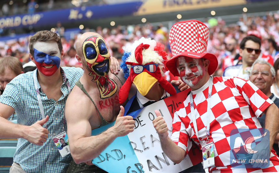 Fans wearing FAN IDs cheer prior to the 2018 FIFA World Cup final match between France and Croatia in Moscow, Russia, July 15, 2018. (Xinhua/Fei Maohua)