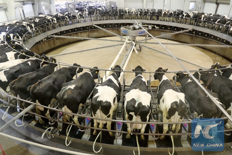Photo taken on March 23, 2018 shows the automatic milking equipment and cows to be milked at Fair Oaks Farms in Fair Oaks, Indiana, the United States. (Xinhua/Wang Ping)