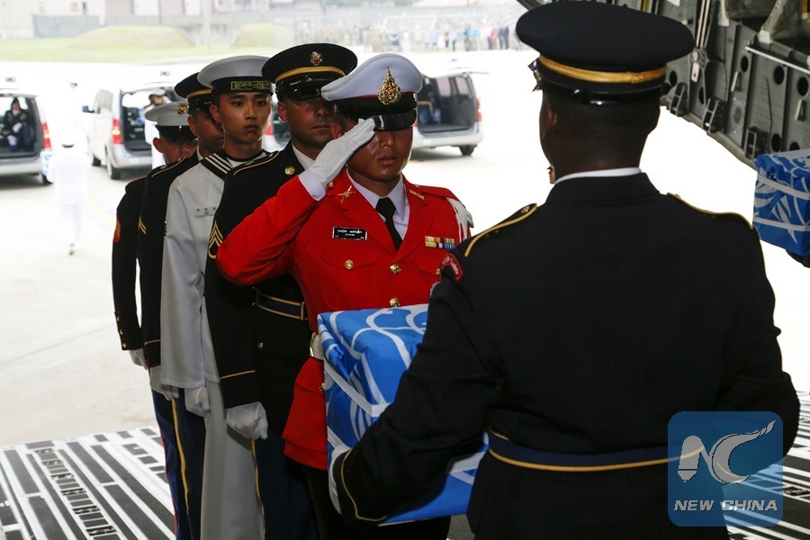 United Nations Honor Guard members carry a box of remains thought to be of U.S. soldiers killed in the 1950-53 Korean War, returned by NorthKorea to the U.S., at the Osan Air Base in South Korea, July 27, 2018. (Xinhua/U.S. Army/ Sgt. Quince Lanford/Handout via REUTERS)
