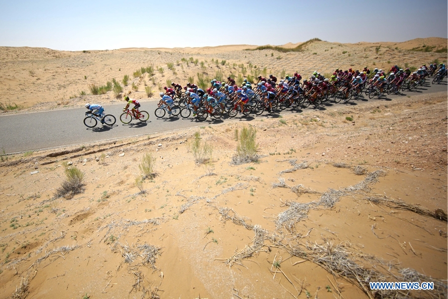 Cyclists compete in the Tenggeli desert in the tenth stage of the Tour of Qinghai Lake in northwest China's Gansu Province, on August 1, 2018. (Xinhuanet Photo by Jia Haiyuan)
