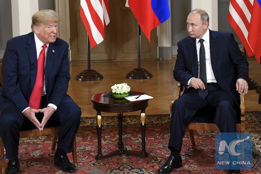 U.S. President Donald Trump (L) meets with his Russian counterpart Vladimir Putin in Helsinki, Finland, on July 16, 2018. (Xinhua/Lehtikuva/Heikki Saukkomaa)