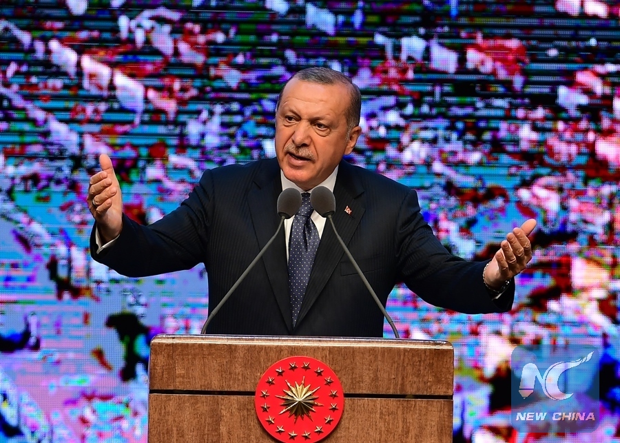 Turkish President Recep Tayyip Erdogan delivers a speech at the presidential palace in Ankara, Turkey, Aug. 3, 2018. Turkish President Recep Tayyip Erdogan on Friday announced an ambitious 100-day action plan, in an attempt to fight currency decline, spur up growth and slow down rocketing inflation. (Xinhua/Mustafa Kaya)