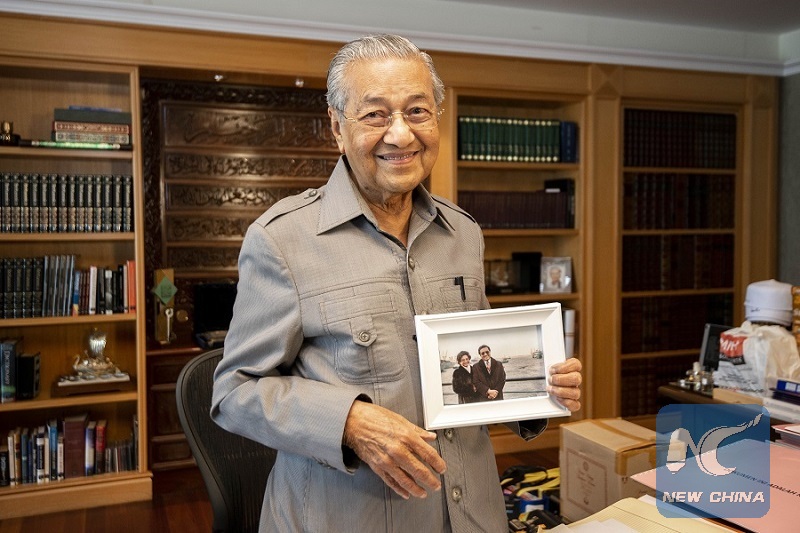 Malaysian Prime Minister Mahathir Mohamad demonstrates a picture showing his visit to China in the 1980s during an interview with Xinhua in Putrajaya, Malaysia, Aug. 16, 2018. (Xinhua/Chong Voon Chung)