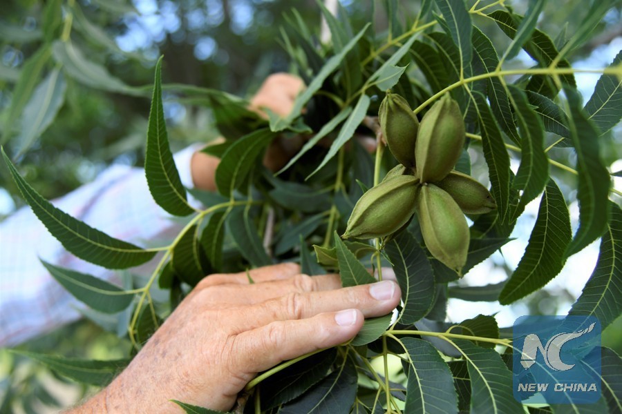 Randy Hudson shows a bunch of pecan on his farm in the State of Georgia, the United States, on July 10, 2018. (Xinhua/Yang Chenglin)