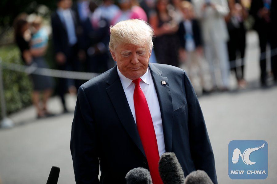 File Photo: U.S. President Donald Trump speaks to reporters before leaving the White House in Washington D.C., the United States, Aug. 17, 2018. (Xinhua/Ting Shen)