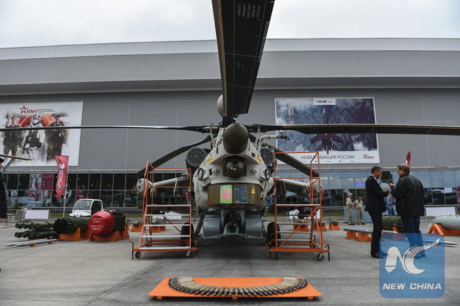 People stand by the helicopter MI-28 at the Army-2018 International Military Technical Forum held in Moscow region, Russia, on Aug. 21, 2018. (Xinhua/Evgeny Sinitsyn)