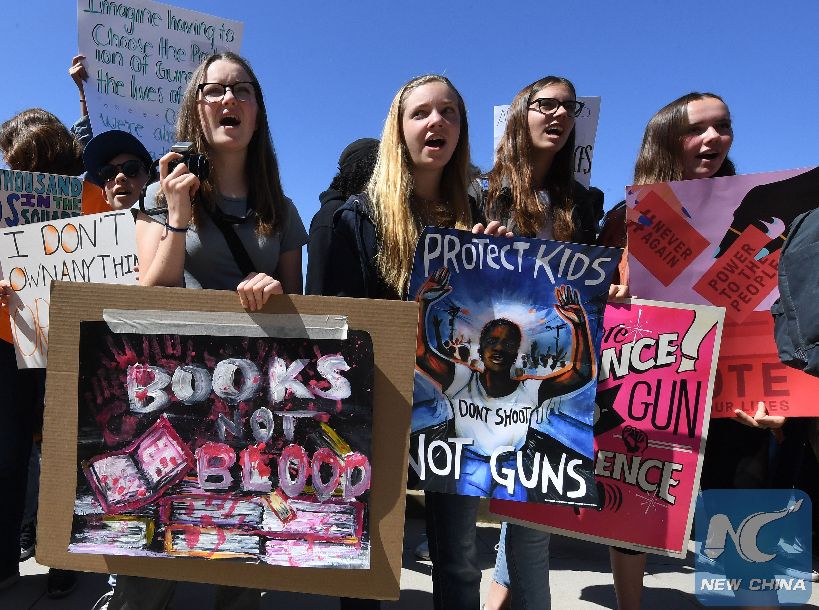 Students from the Santa Monica area participate in a walkout demonstration as part of the National School Walkout for Gun Violence Prevention campaign in Santa Monica, California, the United States on April 20, 2018. (AFP Photo)