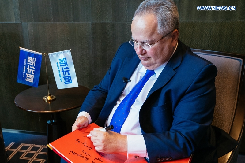 Greek Foreign Minister Nikos Kotzias signs for Xinhuanet during an exclusive interview with Xinhuanet in Beijing, Aug. 27, 2018. (Xinhuanet/Guo Xiaotian)