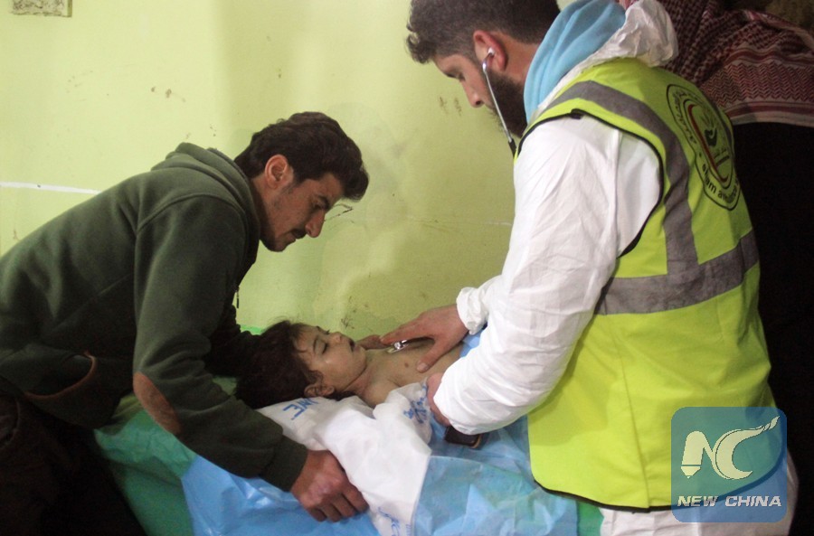 This file photo taken on April 4, 2017 shows an unconscious Syrian child receiving treatment at a hospital in Khan Sheikhun, Idlib province, Syria, following a suspected toxic gas attack. (AFP Photo)