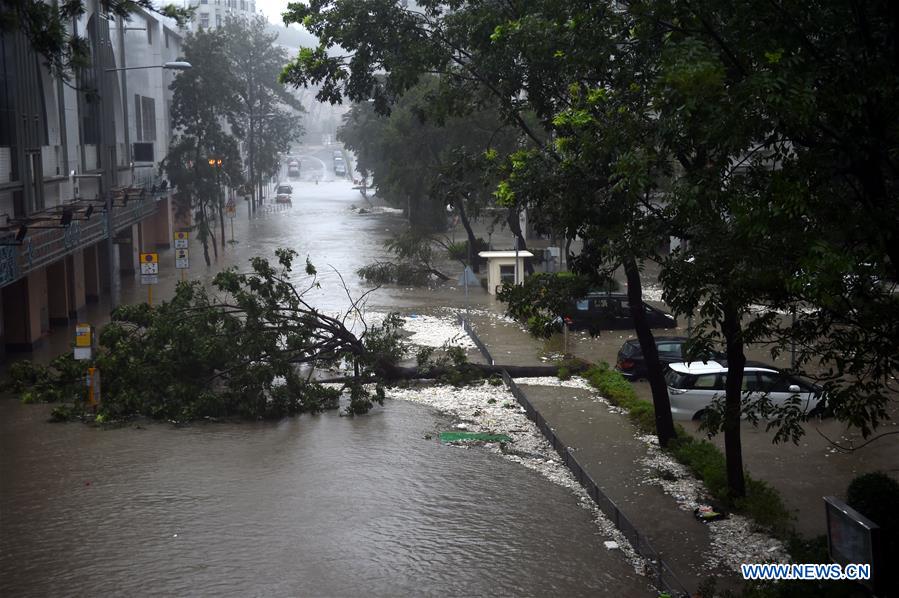 Photo taken on Sept. 16, 2018 shows a waterlogged road in Hong Kong, south China. Hurricane Signal No. 10, the top level warning, was issued by the Hong Kong Observatory at 9:40 a.m. local time on Sunday, and was replaced by the second highest warning Southeast Gale Signal 8 at 7:40 p.m. local time. (Xinhua/Lo Ping Fai)