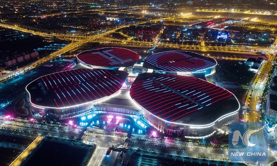 Aerial photo taken on Oct. 21, 2018 shows the National Exhibition and Convention Center (Shanghai), the main venue of the first China International Import Expo (CIIE), held from Nov. 5 to 10, 2018, in Shanghai, east China. (Xinhua/Ding Ting)