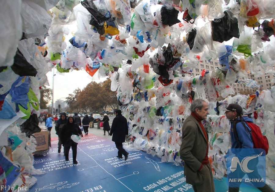 People walk through a tunnel made out of plastic bags in front of La Moneda presidential palace in Santiago, during the World Environment Day on June 5, 2018. (AFP photo)