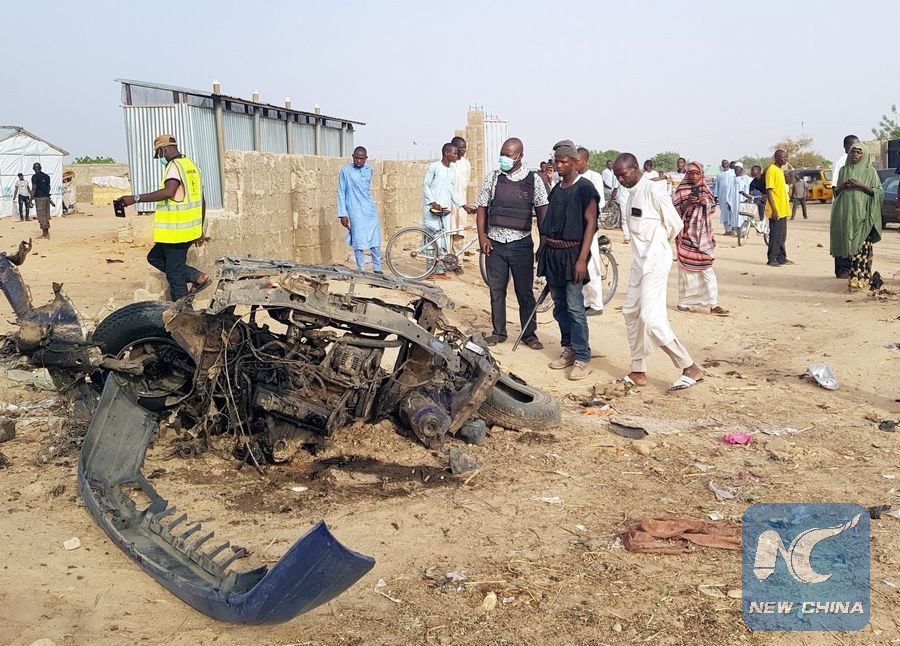 File phtoto taken on April 27, 2018 shows a wreckage of a vehicle after a bomb attack by Boko Haram militia in Maiduguri, Nigeria, April 27, 2018. (Xinhua/NAN)