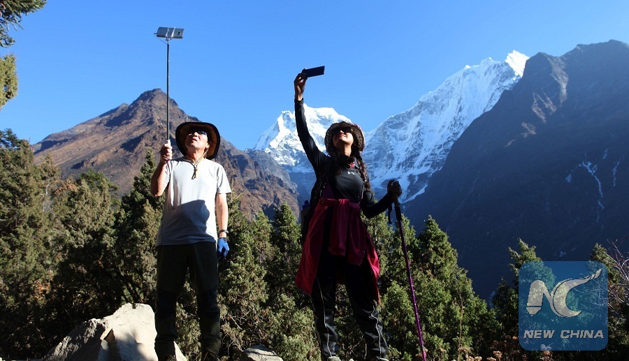 The photo shows tourists take selfie on the trekking route of Himalayas in Solukhumbu, Nepal, Nov. 20, 2016. (Xinhua/Sunil Sharma)