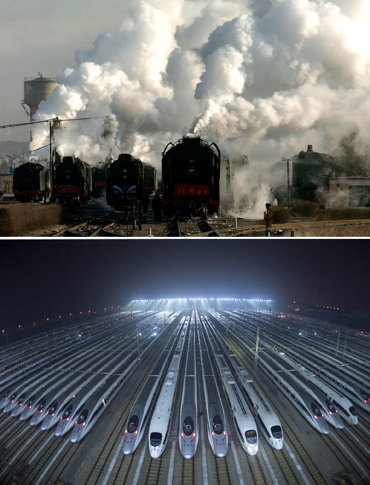 This combo photo shows old-style steam locomotives kept in extended service on the Jining-Tongliao railway in north China's Inner Mongolia Autonomous Region, Dec. 7, 2005 (top, photo taken by Zhang Ling); and bullet trains waiting for maintenance at a train depot in Wuhan, central China's Hubei Province, Jan. 20, 2019 (bottom, photo taken by Xiong Qi).