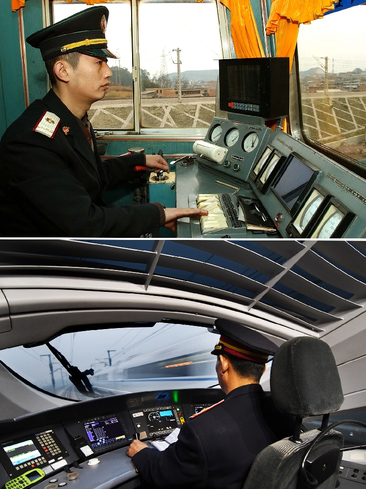 This combo photo shows train driver Zhang Xin working in a locomotive in southwest China's Guizhou Province, Feb. 5, 2004 (top, photo taken by Hou Shaohua); and bullet train driver Zhou Li working during a mission on the Beijing-Tianjin high-speed railway in north China, Jan. 25, 2017 (bottom, photo taken by Yang Baosen).