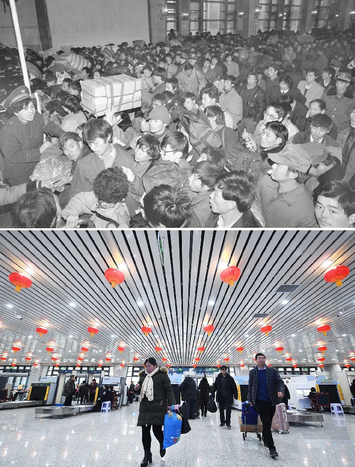 This combo photo shows passengers queuing up to board the trains at the Beijing Railway Station during the Spring Festival travel season in Beijing, capital of China, Jan. 12, 1993 (top, photo taken by Tang Zhaoming); and passengers prepare to board the trains after security check at the Lanzhou Railway Station in Lanzhou, northwest China's Gansu Province, Jan. 20, 2019 (bottom, photo taken by Chen Bin).