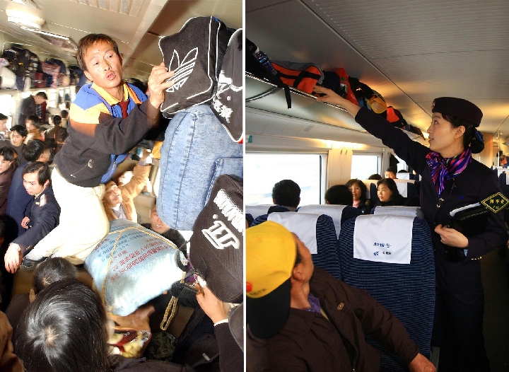 This combo photo shows passengers arranging their luggage in carriage 11 of the train L28 which travels from Fuzhou in southeast China's Fujian Province to southwest China's Chongqing Municipality, Jan. 23, 2003 (left, photo taken by Jiang Kehong); and train conductor Jiang Fei checking the luggage rack aboard a bullet train on the Wuhan-Guangzhou high-speed railway, Jan. 30, 2010 (right, photo taken by Li Mingfang).