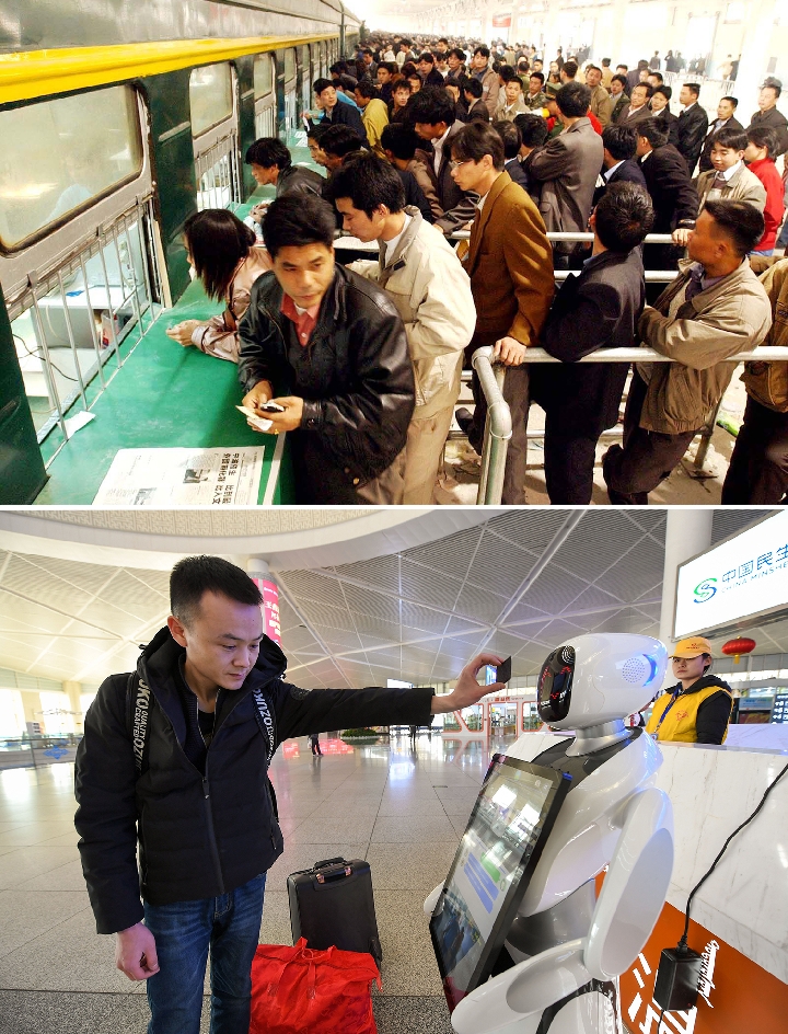 This combo photo shows railway passengers queuing up in front of a make-shift ticket office adapted from train compartments during the Spring Festival travel season in Guangzhou, south China's Guangdong Province, Jan. 20, 2003 (top, photo taken by Zhou Wenjie); and a passenger having his ticket scanned by a robot to get train information at the Hohhot East Railway Station during the Spring Festival travel season in Hohhot, north China's Inner Mongolia Autonomous Region, Jan. 22, 2019 (bottom, photo taken by Peng Yuan).