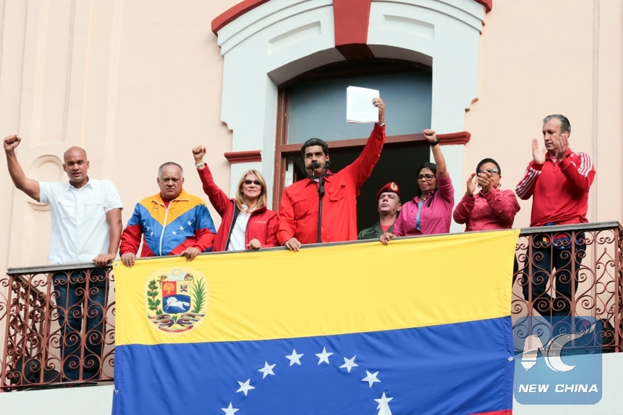Image provided byVenezuela's Presidency shows Venezuelan President Nicolas Maduro (C) taking part in a rally in support of his government, at the Miraflores Palace, in Caracas, Venezuela, on Jan. 23, 2019. Venezuelan President Nicolas Maduro on Wednesday announced he was severing "diplomatic and political" ties with the United States after the U.S. authorities recognized the opposition leader Juan Guaido as the nation's interim president. (Xinhua/Venezuela's Presidency)