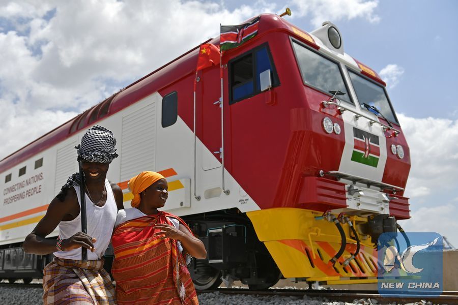 File photo shows Kenyans sing and dance beside one of the first batch of locomotives that were made by Chinese companies for the Mombasa-Nairobi Standard Gauge Railway, in Mombasa, Kenya, on Jan. 11, 2017. (Xinhua/Sun Ruibo)