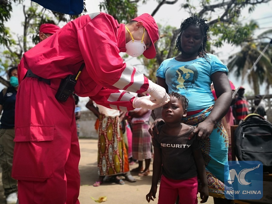 A medical member of Chinese rescue team measures body temperature for a boy at a temporary shelter for victims of Cyclone Idai in Beira, Mozambique, March 27, 2019. (Xinhua/Nie Zuguo)