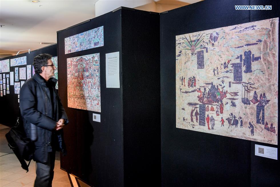 A visitor appreciates the exhibiton titled "Let's Dunhuang: cultural experience from Dunhuang with innovation" during the "2018 China Week" in Wellington, New Zealand, June 8, 2018. (Xinhua/Guo Lei)
