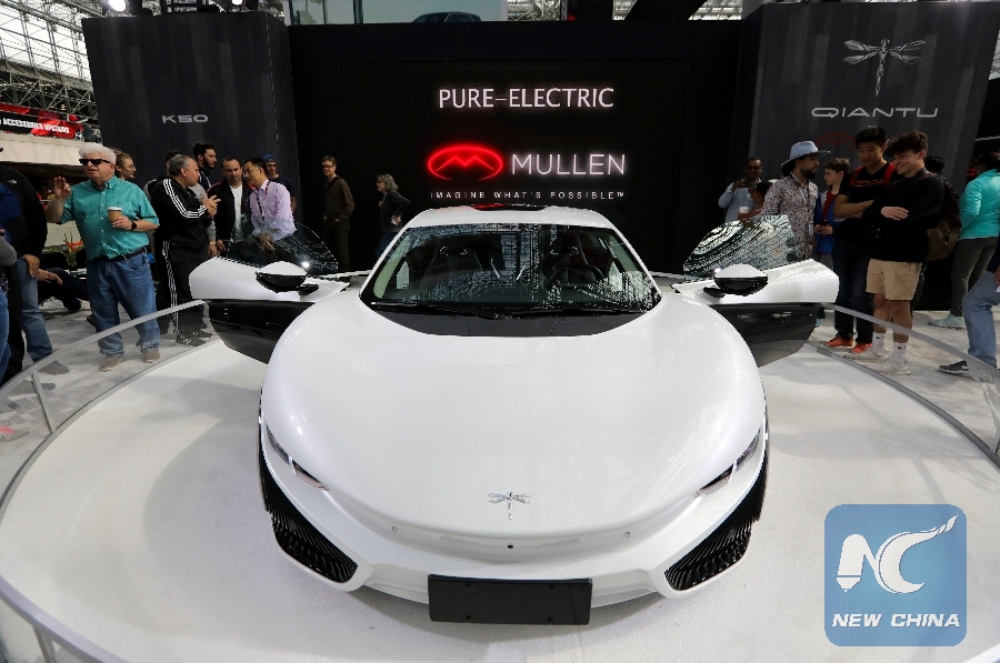 Chinese electric vehicle (EV) Qiantu K50 is seen at the 2019 New York International Auto Show in New York, the United States, April 19, 2019. (Xinhua/Wang Ying)