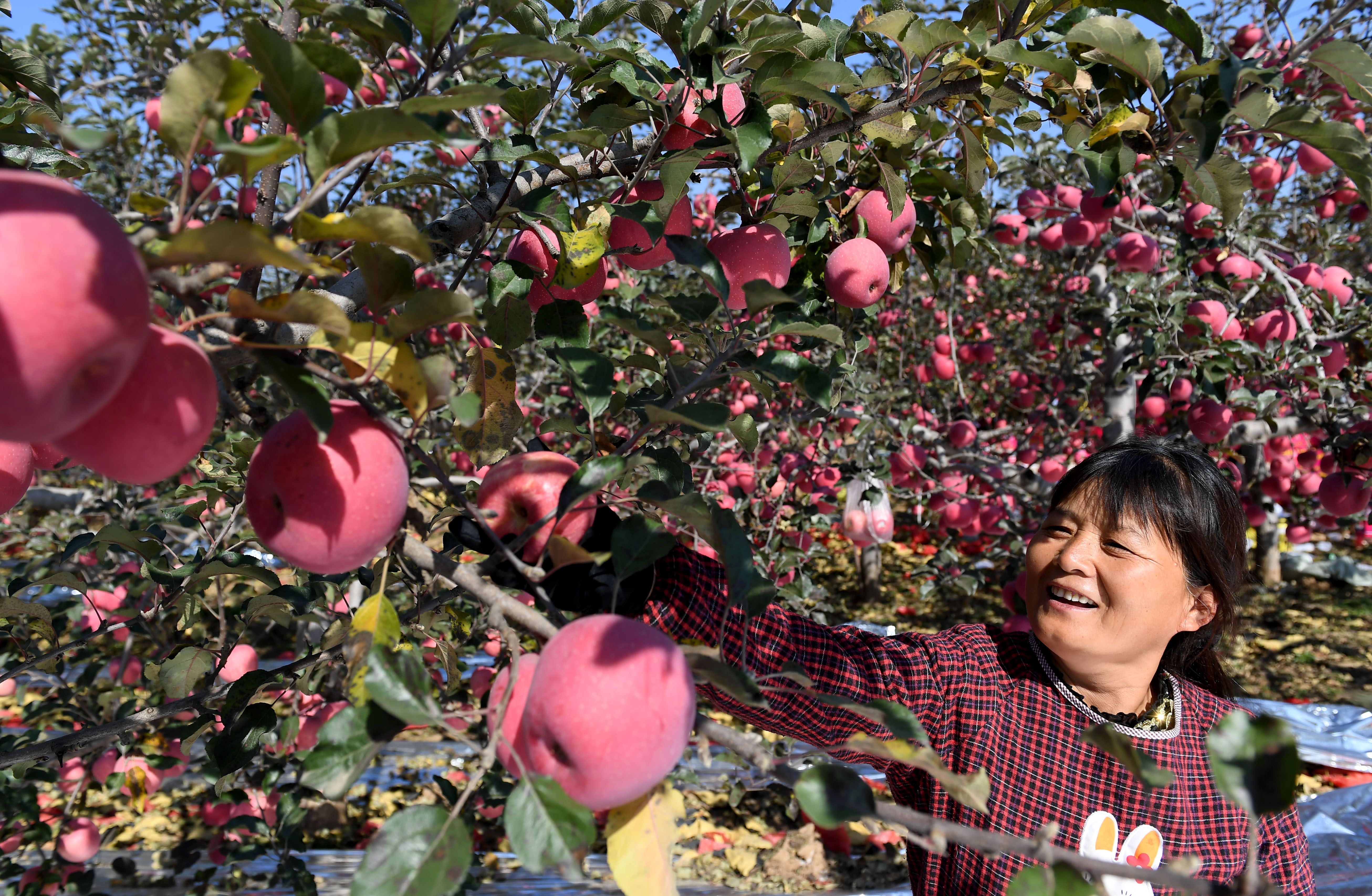A villager picks apples at an orchard in Taiquan Village of Yichuan County, Yan'an City, northwest China's Shaanxi Province, Oct. 15, 2018. (Xinhua/Liu Xiao)