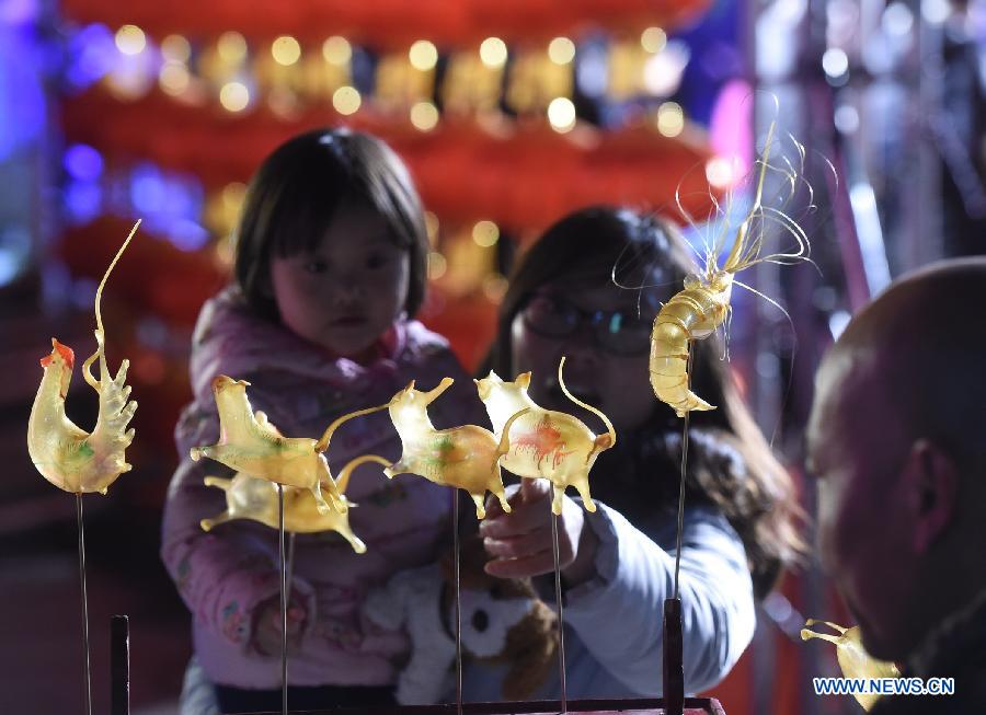 People view a performance of sugar-figure blowing by a folk artist during a lantern fair in Beijing, capital of China, Feb. 28, 2018. China will hold the Conference on Dialogue of Asian Civilizations starting from May 15. Under the theme of "exchanges and mutual learning among Asian civilizations and a community with a shared future," the conference includes an opening ceremony and sub-forums. (Xinhua/Luo Xiaoguang)