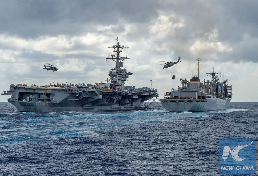 This handout picture released by the U.S. Navy on May 8, 2019 shows the Nimitz-class aircraft carrier USS Abraham Lincoln (CVN 72) while conducting a replenishment-at-sea with the fast combat support ship USNS Arctic (T-AOE 9), while MH-60S Sea Hawk helicopters assigned to the "Nightdippers" of Helicopter Maritime Strike Squadron (HSM) 5, transfer stores between the ships. (U.S. Navy Office of Information)