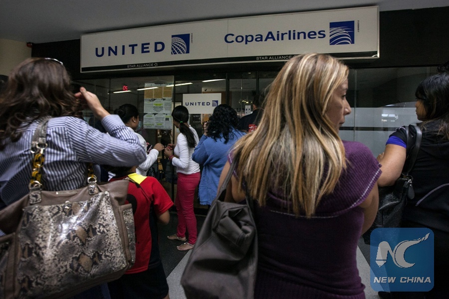 The file photo shows that people wait in front of a closed office of United Airlines and Copa Airlines in Caracas, capital of Venezuela, on Jan. 25, 2014. (Xinhua/Boris Vergara)