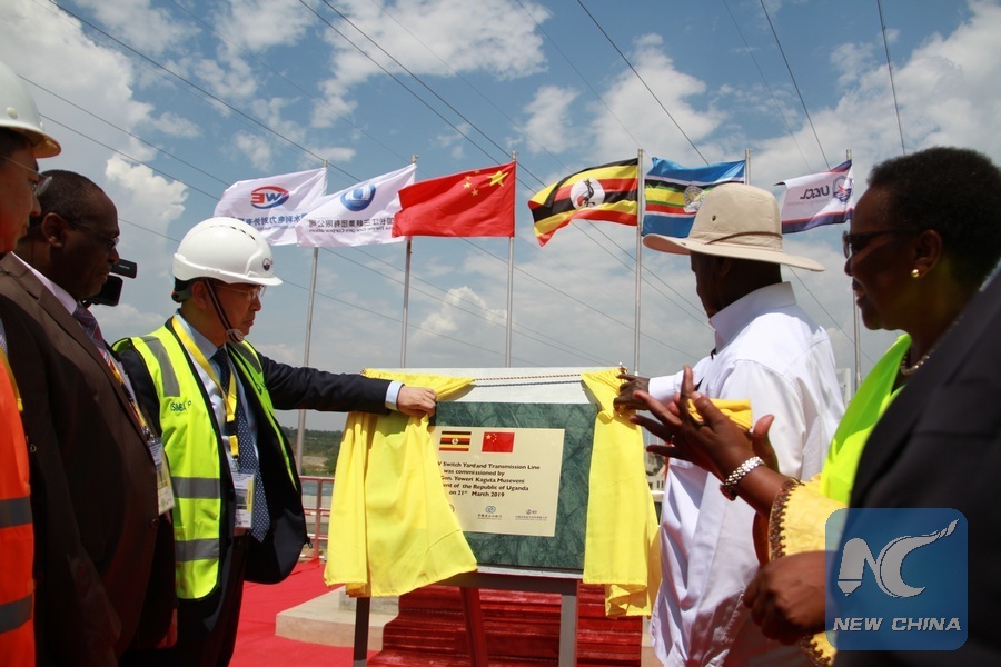Uganda's President Yoweri Museveni (R, back) and Zheng Zhuqiang (L, back), the Chinese ambassador to Uganda, unveil a milestone during an inauguration ceremony in Kayunga, Uganda, March 21, 2019. Uganda's President Yoweri Museveni on Thursday inaugurated the Chinese-built Isimba Hydropower Plant on the Victoria Nile in the central part of the African country. (Xinhua/Zhang Gaiping)