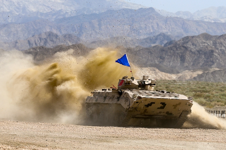 An armored vehicle operated by a Chinese crew drives during a match of the International Army Games 2018 in Korla, northwest China's Xinjiang Uygur Autonomous Region, Aug. 5, 2018. (Xinhua/Wang Pengfei)