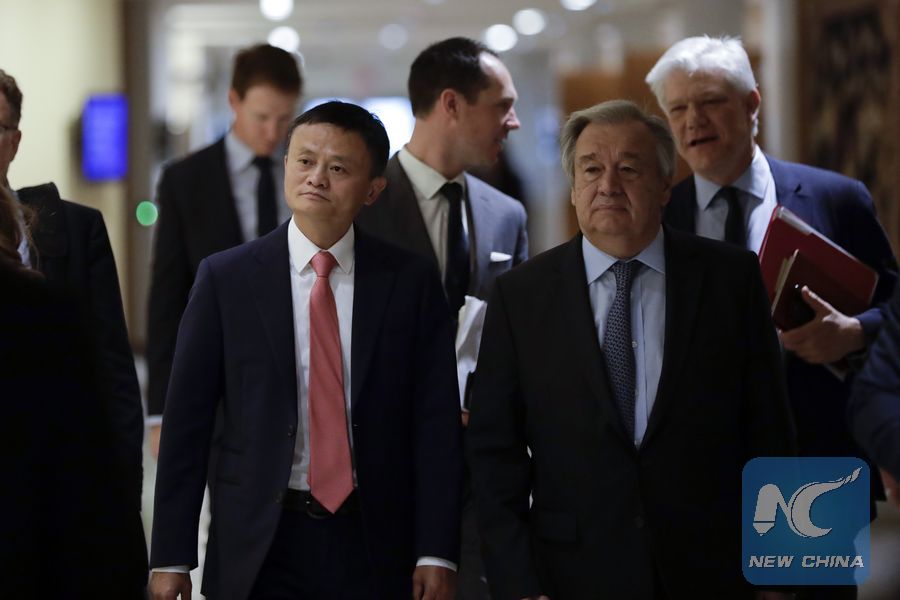 Jack Ma, executive chairman of Alibaba group and United Nations Secretary-General Antonio Guterres arrive to attend a high-level panel on digital cooperation, at the UN headquarters in New York, June 10, 2019. (Xinhua/Li Muzi)