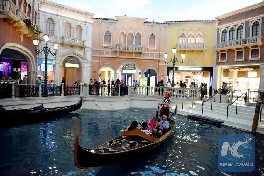 Visitors ride a boat at the Venetian Resort in Las Vegas, the United States, May 12, 2019. Las Vegas is located in the state of Nevada in the west of the United States. It is most commonly known for its gambling resorts and nightlife. (Xinhua/Han Fang)