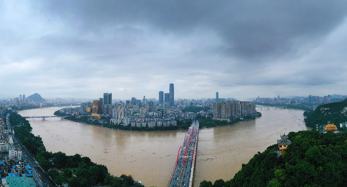 Aerial photo taken on June 10, 2019 shows Liujiang River in Liuzhou City, south China's Guangxi Zhuang Autonomous Region. Due to downpours in the upper reach of the Liujiang River, the first flood peak of the river arrived in Liuzhou on June 10. (Xinhua)