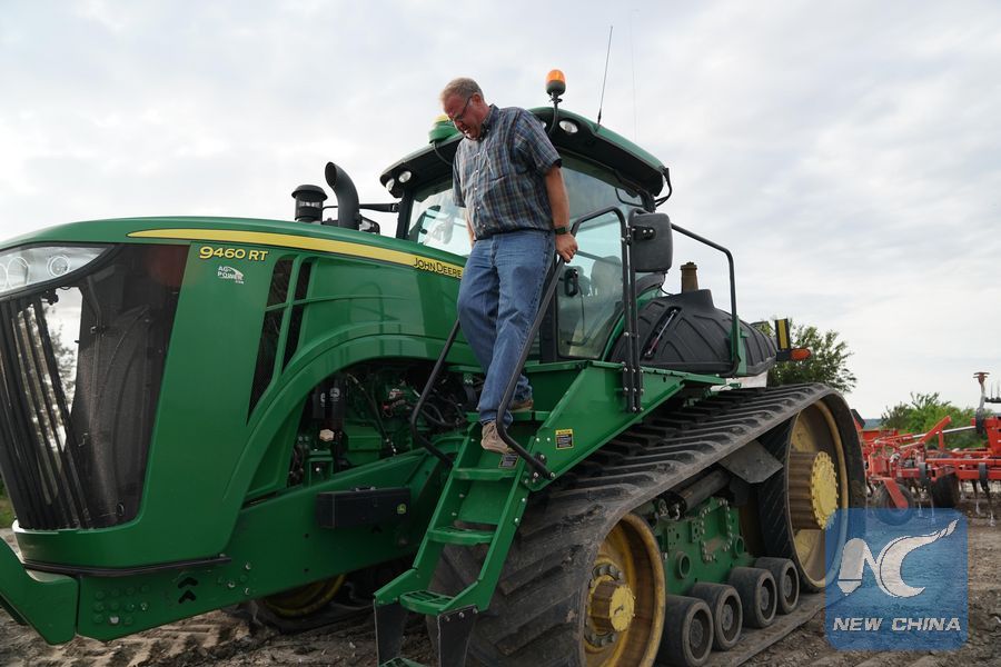 Tom Waters, a seventh-generation farmer, comes down from his tractor on his farmland in Orrick, Missouri, the United States, on June 9, 2019. (Xinhua/Liu Jie)