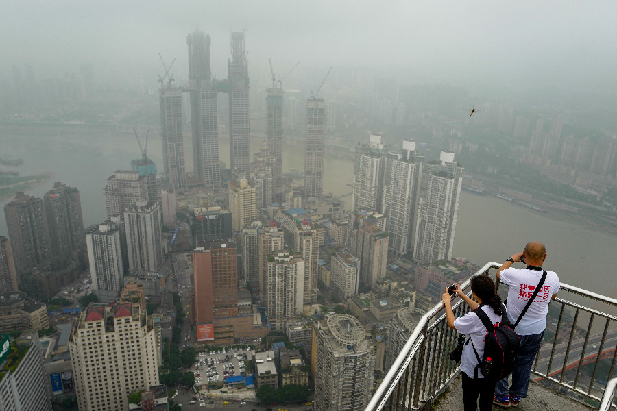 Participants stand on the roof of a skyscraper as they take photos of high-rise buildings in Chongqing, southwest China, June 18, 2018. (Xinhua/Liu Chan)