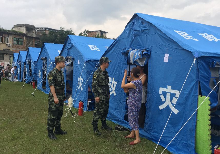 Medical staff of armed police force visit people at a temporary shelter in Shuanghe Town High School in Changning County of Yibin City, southwest China's Sichuan Province, June 18, 2019. (Xinhua)