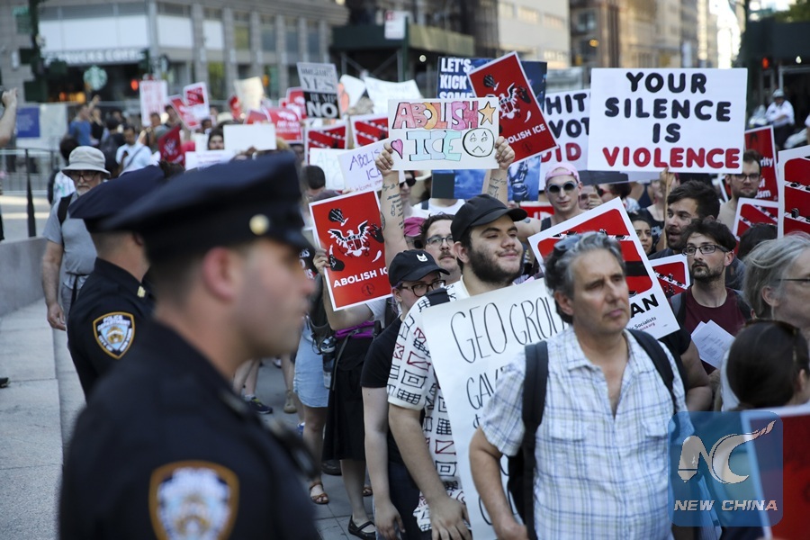People take part in the "March to Abolish ICE" protest in New York, the United States, June 29, 2018. Hundreds of people took part in the march on Friday, calling for the complete abolition of Immigration and Customs Enforcement (ICE) and an end to mass incarceration to illegal immigrants. (Xinhua/Wang Ying)