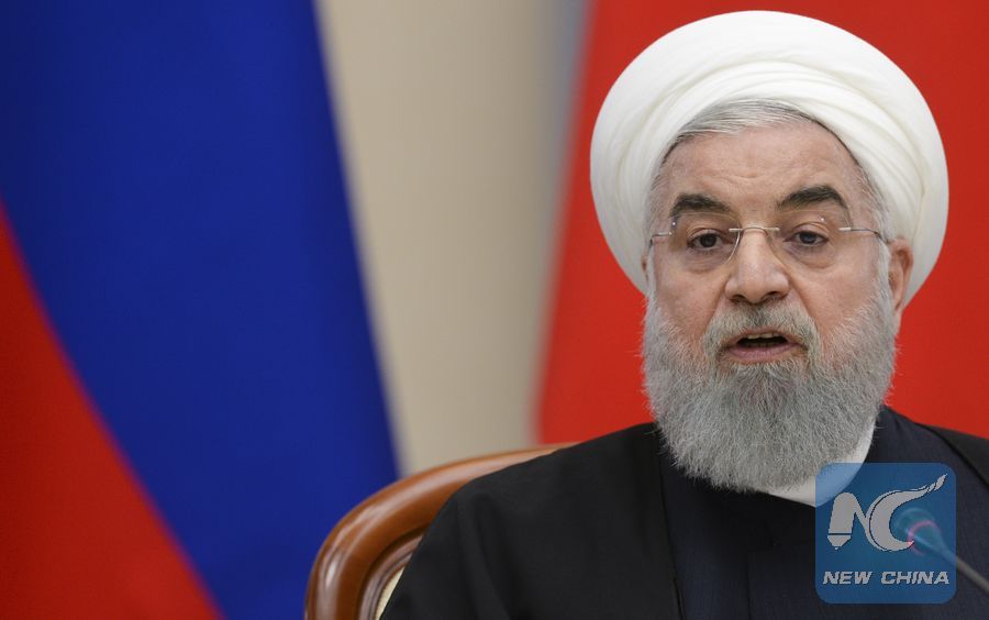 Iranian President Hassan Rouhani speaks during a meeting with Russian President Vladimir Putin and Turkish President Recep Tayyip Erdogan in Sochi, Russia, on Feb. 14, 2019. Russia, Turkey and Iran on Thursday agreed on several key directions of future interaction in the settlement of the Syrian crisis after a trilateral summit of their presidents in the Russian city of Sochi. (Xinhua/Sputnik)