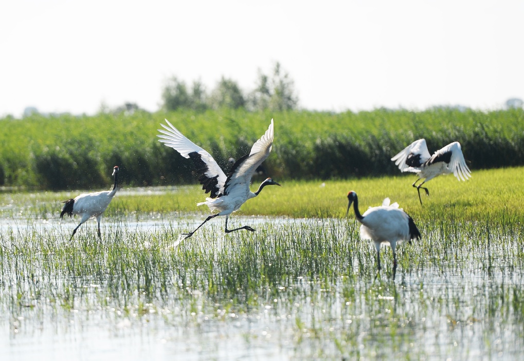 Red-crowned cranes are seen at Zhalong National Nature Reserve in Qiqihar, northeast China's Heilongjiang Province, July 31, 2018. (Xinhua/Wang Kai)