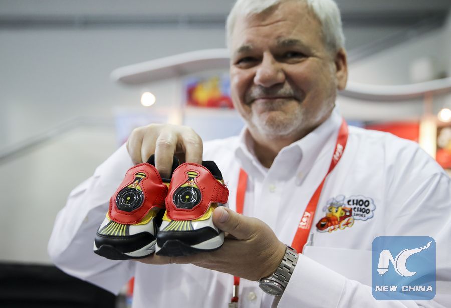 Ken Silvestri, a staff worker of Choo Choo Shoes, shows the company's products to visitors at their booth during the 116th Annual North American International Toy Fair at the Jacob K. Javits Convention Center in New York, the United States, on Feb. 18, 2019. Imposing more tariffs on China would cripple the business of small U.S. toy companies that have made many success stories with their Chinese partners during the past decades, an industry insider has warned.